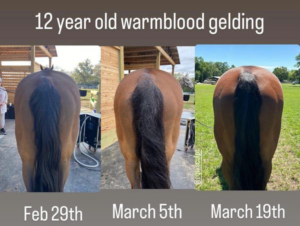 This is a 6 year old OTTB who came to us in December. He had been off the track for two years but since then he wasn't getting the best care. We started him back into light work and added two PEMF sessions per week and one VIBE shockwave session per week to his weekly routine.The goal was to help with muscle recovery with the PEMF and we used the VIBE to break up scare tissue in his SI area. As you can see by his before and after photo he's made such an amazing transformation in just two weeks.