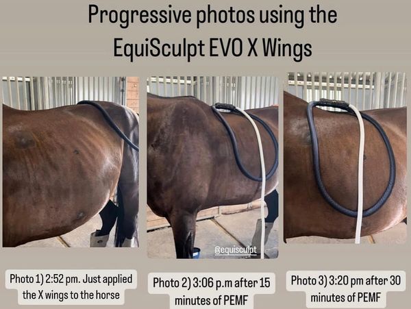 Flag is a 20 year old warmblood gelding who contracted Pigeon Fever. He got very, very, ill as he developed lesions on his lungs, and abscesses on his muscles. Flag was under the supervision of a veterinarian who put him on antibiotics to help with the bacterial infection. After 2 months Flag had lost alot of muscle and was still showing some signs of lameness in his left hind. His owner had us try the X wings on him to help with pain and inflammation. The amazing thing was how you could actually see throughout his session how his body began to change and "fill out" right before our eyes. The PEMF had an immediate effect on Flag and he looked more hydrated and walked off sounder after just one 45 minute full body session.