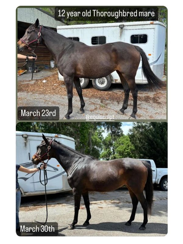 Truly is a beautiful Thoroughbred mare that we worked on in Florida. Her owner contacted us because she felt like Truly was losing muscle over her topline due to age and that the owner could not ride her much during the week. We did 2 full body EquiSculpt sessions on Truly and as you can see she really blossomed. There were no other changes to her feed or exercise program during this time.