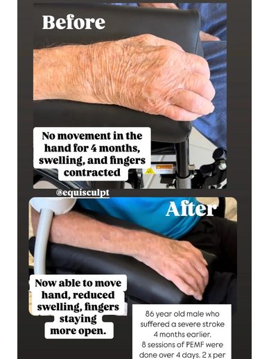 One of our most exciting cases to date! We were asked to work on a family member who had suffered a debilitating stroke 4 months earlier which resulted in full paralysis of his right arm. His doctor said it was highly unlikely he would ever regain movement in the arm or hand. It took only four session (15 minutes each session 2 x per day) to see the PEMF working. Not only did he start to regain movement in his hand, the swelling was greatly reduced, the temperature of his hand came back to normal and his contracted fingers For this case his aid (RN) used the EZ Model.